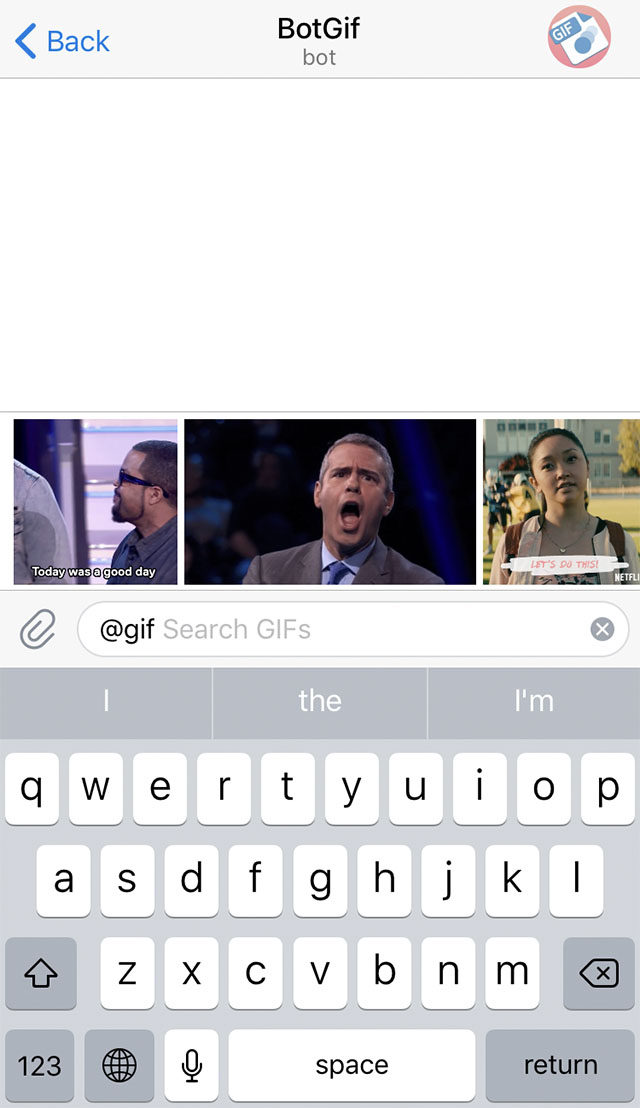 Use the /newbot command to create a new bot. The @GIFBot will ask you for a name and username, then generate an authorization token for your new bot.