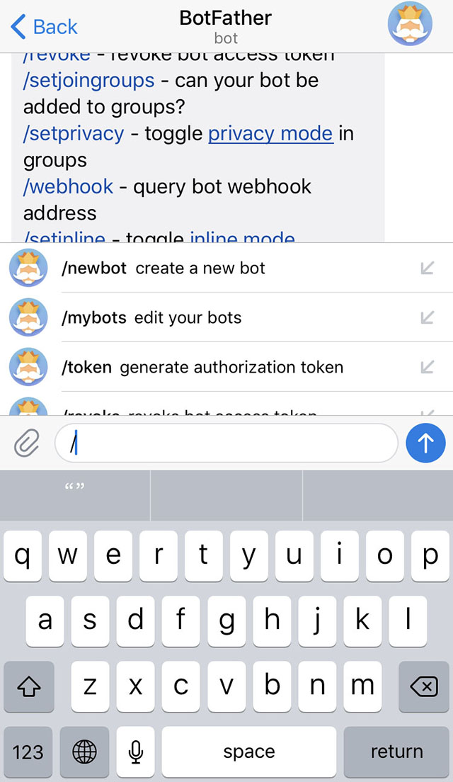 Whenever your bot sends a message, it can pass along a special keyboard with predefined reply options (see ReplyKeyboardMarkup). Potato apps that receive the message will display your keyboard to the user. Tapping any of the buttons will immediately send the respective command. This way you can drastically simplify user interaction with your bot.