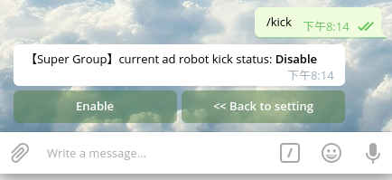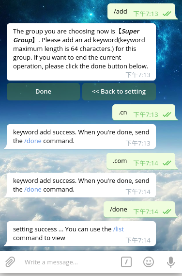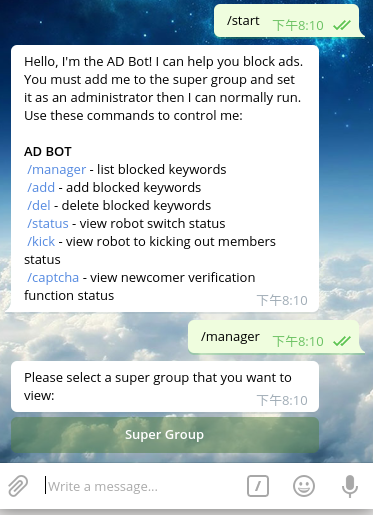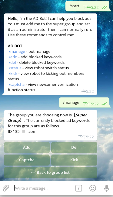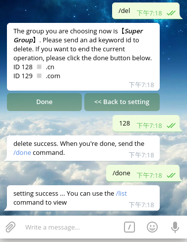 /done command to submit or finish the current operation.After adding keywords, ADBot will kick the user who sends sensitive words out of the group and bolck him. E.g. if you want to kick off all users who send URLs, you can filter such keywords as ".com" and "www".