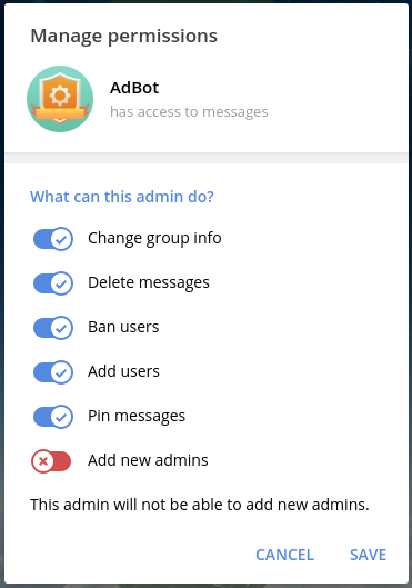 Bots are frequently added to groups in order to augment communication between human users, e.g. by providing news, notifications from external services or additional search functionality. This is especially true for work-related groups. Now, when you share a group with a bot, you tend to ask yourself “How can I be sure that the little rascal isn't selling my chat history to my competitors?” The answer is — privacy mode.